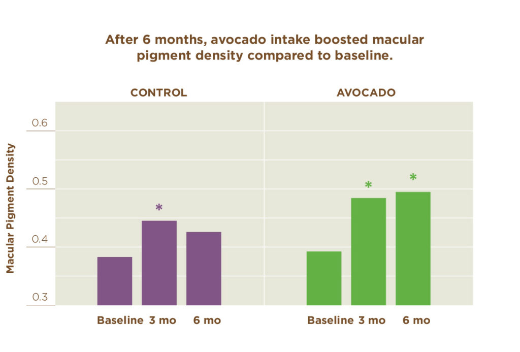 Avocado significantly increased macular pigment density (MPD) by 26% after 6 months of intake, relative to baseline. The control group had no significant increases in MPD at 6 months.