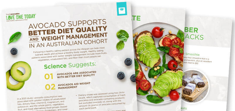 Avocados are a rich source of nutrients including monounsaturated fats, dietary fibre, potassium and magnesium, as well as phytochemicals. However, no epidemiological analysis for the associations between avocado consumption and participant anthropometric measures has been conducted in Australia. The present study aimed to perform a secondary analysis of the 2011-2012 National Nutrition and Physical Activity Survey (NNPAS) to quantify avocado consumption in the Australian population and explore the associations between avocado intakes, consumption of nutrients and food groups based on the Australian Dietary Guidelines (ADGs) and anthropometric measurements. Usual avocado consumption in the 2011–2012 NNPAS was determined using the multiple source method regression model. The relationship between avocado consumption and intakes of key nutrients and food groups, and participant weight, BMI and waist circumference were examined using linear regression. Mean avocado intake was 2.56 (95% CI: 2.37, 2.75) grams per day with 15.9 % of Australians considered to be ‘avocado consumers’ (n=21,526,456 population size; n=12,153 observations). Greater consumption (g) of avocados was associated with significantly higher consumption of monounsaturated fats, polyunsaturated fats, dietary fibre, vitamin E, magnesium and potassium, as well as ‘whole grains’, ‘vegetables’, ‘fruit’ and ‘meat and alternatives’ food groups. Greater consumption (g) avocados was associated with significantly lower consumption of carbohydrates and discretionary foods. When adjusted for covariates, greater consumption of avocados was significantly associated with a lower body weight (p=0.034), BMI (p<0.001), and waist circumference (p<0.001). Avocados may be incorporated into an eating pattern, and may be beneficial in weight management.