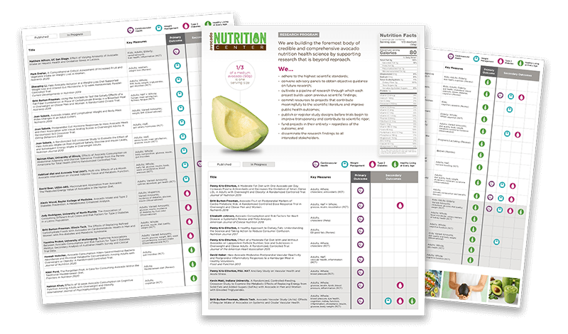 Find nutrition research on the benefits of avocados for cardiovascular health, weight management, type 2 diabetes, and healthy living at every age