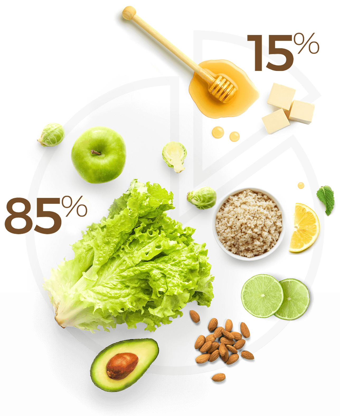 That leaves 15% of calories for other uses, such as adding a teaspoon of honey to your tea or a pat of butter to your vegetables.