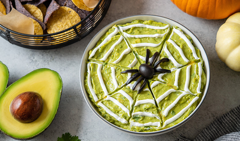 Make the creamiest guacamole ever with a fun Halloween twist! Add hot sauce for heat, top with a sour cream spiderweb and black olive spider.