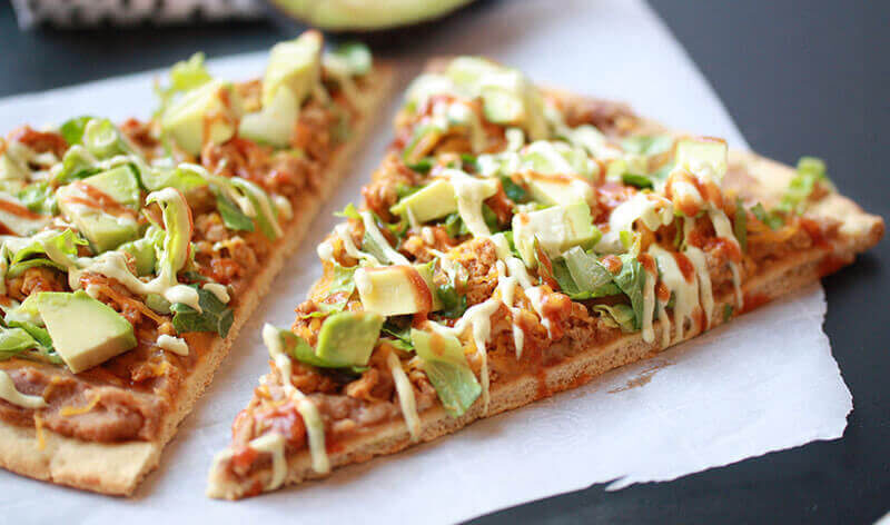 Creamy avocado ranch tops this zesty Mexican-inspired pizza. Recipe created by Nicole Ring, RD and Lauren Rezende, MPH, RD.