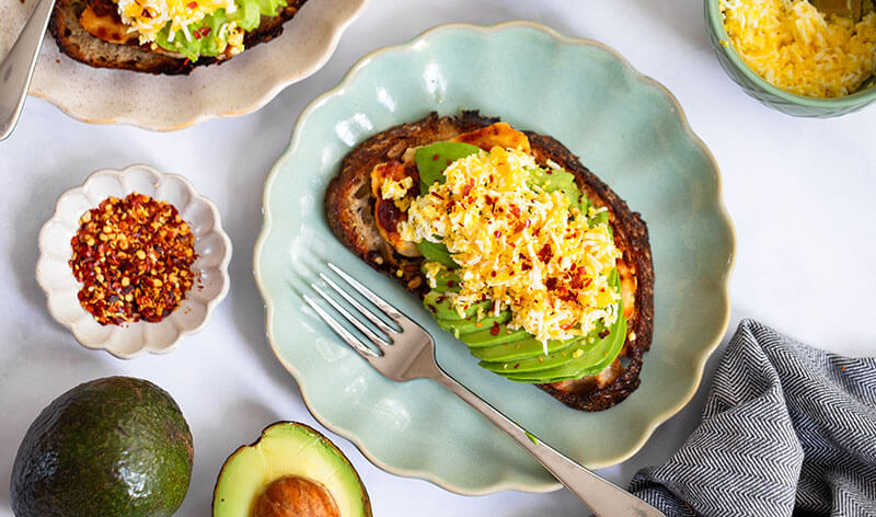 Adding protein can turn avocado toast into a full breakfast meal. This delicious combo of avocado toast with grillable cheese, grated hard-boiled egg, honey, and red pepper flakes is sure to become a new favorite.