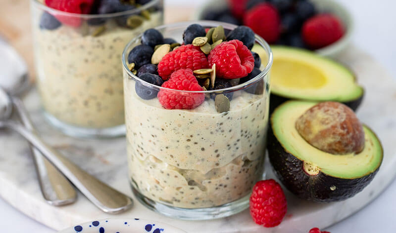 Give your overnight oats a nutrient-boost by adding avocado! For these avocado banana oats, avocado is blended with the milk to make them extra creamy. It’s a great way to make them more filling with healthy fats and fiber.