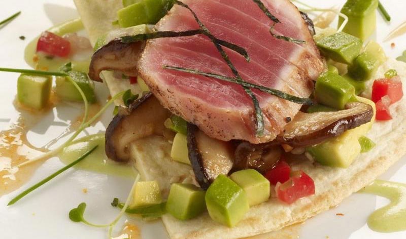 This taco-shimi crisp is a fusion of Mexican and Asian cuisines combining a tortilla crisp with seared Ahi tuna, avocado and shiitake mushroom relishes. Created […]