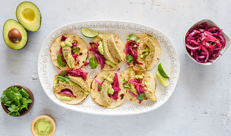 - Place 1-2 avocado fries on each corn tortilla. Top with pickled red onion and avocado sauce, dividing evenly. Serve with lime wedges and garnish with chopped cilantro.