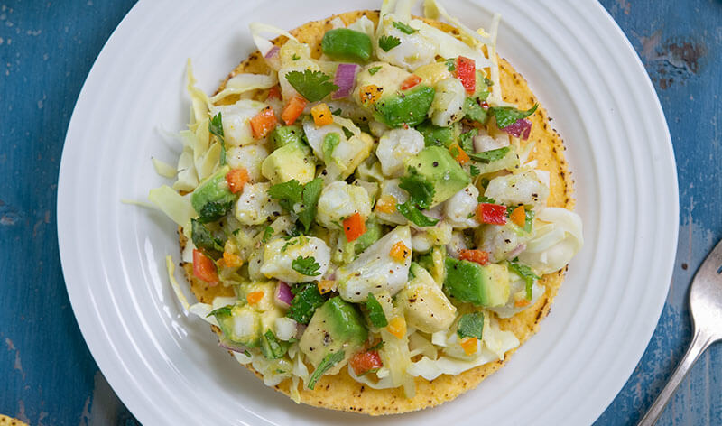 - Chill thoroughly then serve on a thin bed of shredded cabbage atop the crispy corn tortillas.