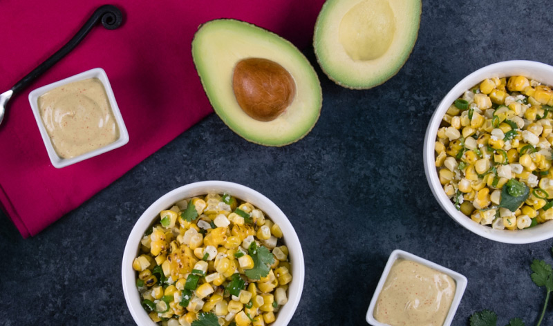 In this fun take on elote salad – Mexican corn on the cob – avocado replaces mayonnaise.