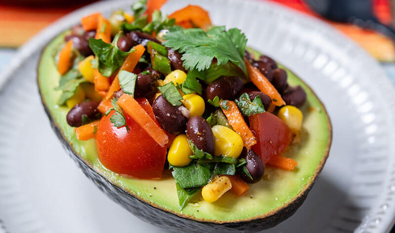 This easy and delicious recipe is a great healthy lunchtime meal option. The fresh black bean and corn salad comes together quickly and acts as a nutritious, crunchy vegan filling for creamy avocados. All of the delectable ingredients fit perfectly into an avocado half. Which makes for a great healthy meal.