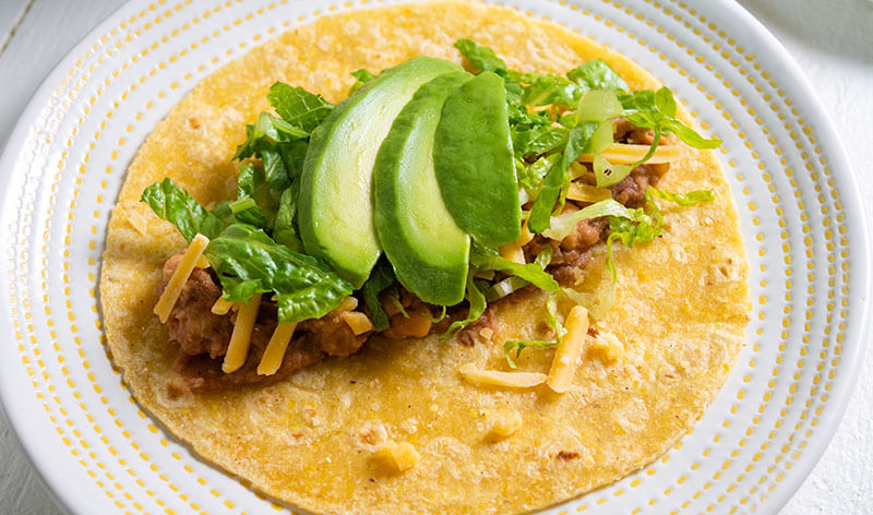 - Remove tortillas from oven. Fill each tortilla with about two tablespoons of the bean mixture. Top with fresh avocados, chopped lettuce and the remaining cheese