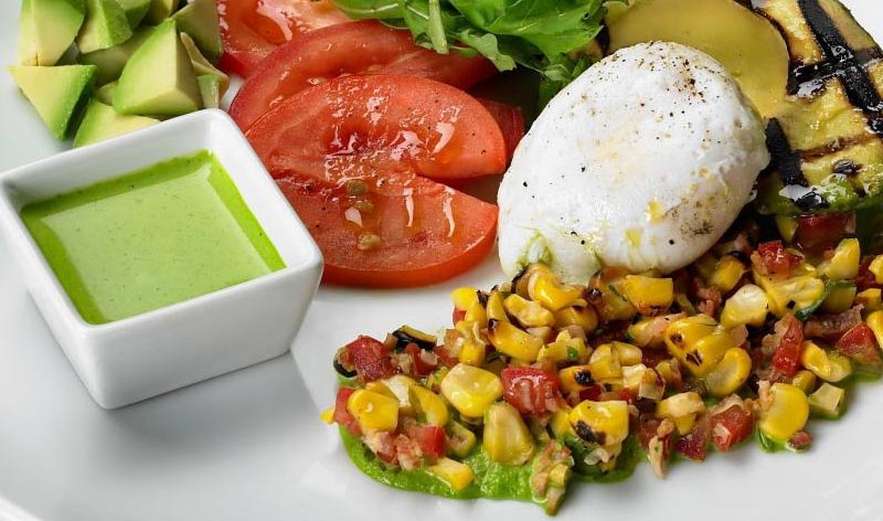 - Place a poached egg into the cavity of each of the avocado halves and top with the poblano sauce.