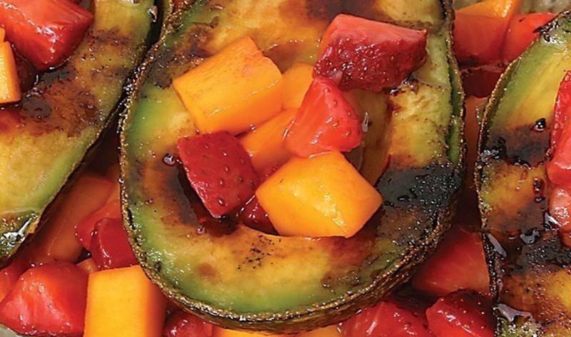 - With a spatula, carefully remove the avocados from the grill and place them on beds of lettuce on warm serving plates, 2 halves per person. Fill the seed cavity of each avocado half with the mango-strawberry salsa. Serve with spoons to scoop out the avocado flesh and salsa.