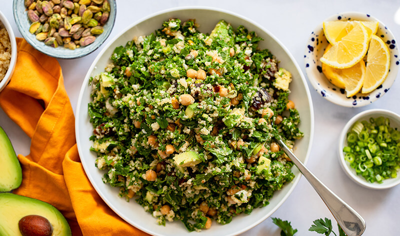 If you are looking for something new to make for lunch, try this Moroccan-inspired quinoa salad. Kale and quinoa create a fiber-licious base for this salad with avocado, pistachios, dates, and a simple lemony dressing.