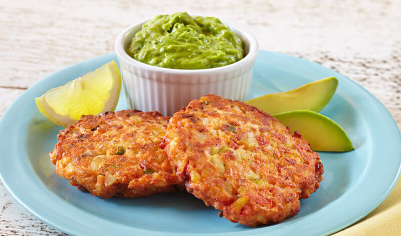 - Serve salmon cakes with Avocado Cream Sauce and prepared salad.