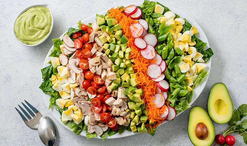 - Arrange avocados, eggs, tomatoes, chicken, carrots, mushrooms, snap peas and radishes into even rows across the top of the lettuce leaves, creating an Easter egg design. Serve with Avocado Dijon Dressing on the side.