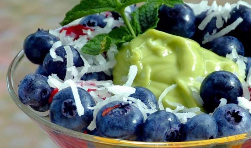- When ready to serve, divide the avocado cream among 8 stemmed glasses or dessert bowls (about 1/3 cup each). Top each serving with approximately 1/3 cup of the berries. Garnish each portion with 1 teaspoon shredded coconut and top with a mint sprig.