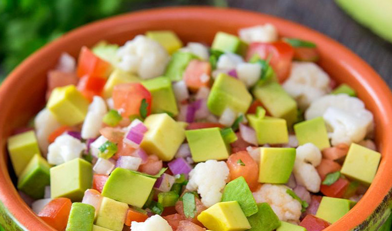 - In a large bowl, combine avocado, cauliflower, tomatoes, onion, jalapeño, garlic, cilantro, lime juice, salt and olive oil.
